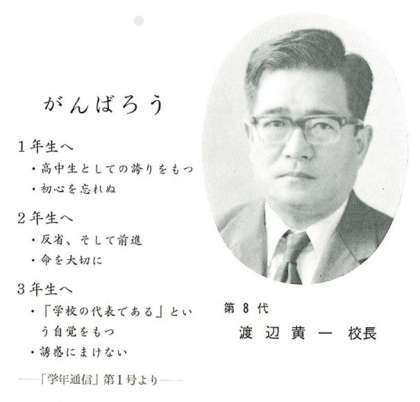 さて、私たちが入学したのは昭和22年4月であったと思い起こす時に、それがまた新学制によって本校が発足をした年でもあることに格別の親しみを感じます。そのころは未だ現在の中学校の建物は何もなく、一帯は、高岡村に代表された田園風景があって、入学した私たちは暫くの間を旧高等小学校の校舎で学んだのであります。とは申しても、あの戦後のようやくにして復興への槌音が鳴り出した時代でのこと、生活物資をはじめ学用品とて恵まれた状態ではありません。答案用紙1枚にしても少し強く書けば破れる、粗末なわら半紙でしかなく、試験の時など問題とにらめっこで、恐る恐る鉛筆を運んだ記憶がございます。また、通学に欠くことのできない履物の多くも、再生ゴムを使った底の硬いズック靴かわら草履で、私も時には母が作ってくれた草履で、地域的に4kmの道を歩いて1〜2往復すれば破れてしまうので、時々裏側を水に浸して土をつけたりして、少しでも長く持たせようと気を配りながら通いました。