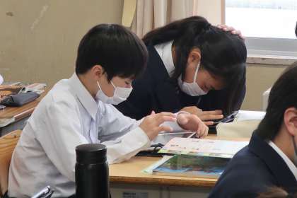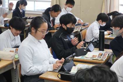 「東北地方の魅力を探ろう」をテーマに、各自で魅力を探し、意見交換に向けたまとめに取り組んでいました。