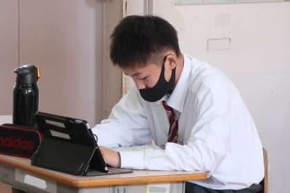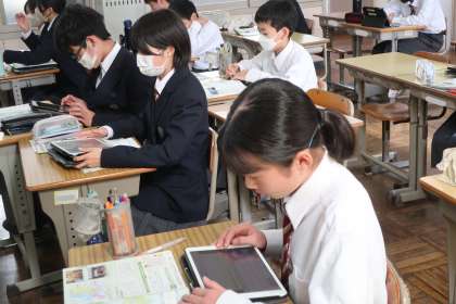 「ヨーロッパの基本的な知識を確認しよう」をテーマに、地図帳から特徴を、教科書から重要な言葉を探し出していました。