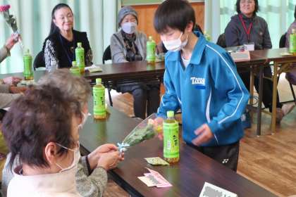 1〜3年の約10名の生徒がボランティアとして参加しました。学区の高齢者との話や交流で盛り上がり、有意義な時間を過ごしました。その後、交流館に再集合し、各会場での学びを全体に発表しました。