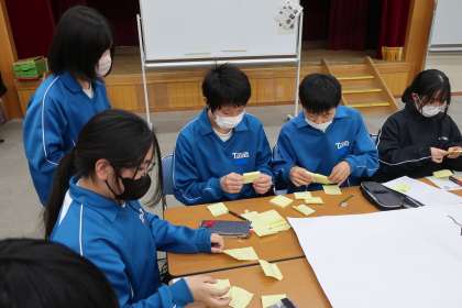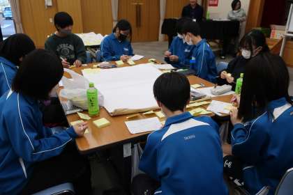 1〜3年の約10名の生徒がボランティアとして参加しました。学区の高齢者との話や交流で盛り上がり、有意義な時間を過ごしました。その後、交流館に再集合し、各会場での学びを全体に発表しました。