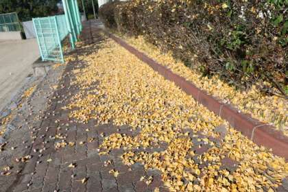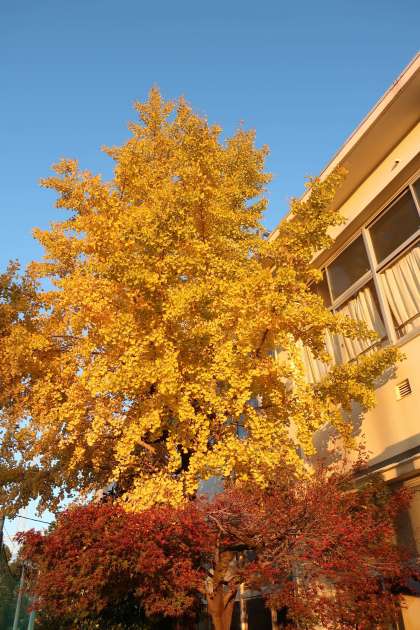 朝日に照らされ黄金色に輝くイチョウの木。地面に目をやるとイチョウの葉が黄色のじゅうたんをつくり始めています。落ち葉はきという活動も大切ですが、心が癒されるこうした風景をしばらくは残していきたいでものです。