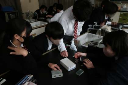 これまで知識として身につけてきた光の屈折。今回は実験を通して確認していました。