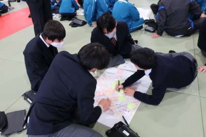 さまざまな学習形態で授業を進める3年生。今回のテーマは防災。講師に愛知工業大学の教授をお招きして行いました。