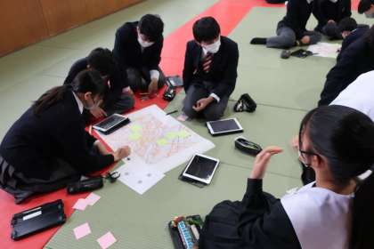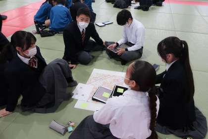 さまざまな学習形態で授業を進める3年生。今回のテーマは防災。講師に愛知工業大学の教授をお招きして行いました。