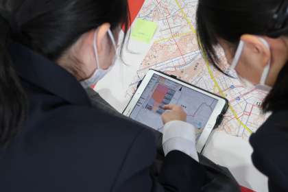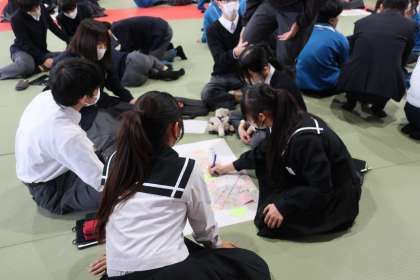さまざまな学習形態で授業を進める3年生。今回のテーマは防災。講師に愛知工業大学の教授をお招きして行いました。