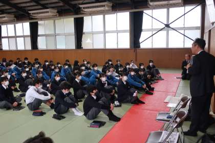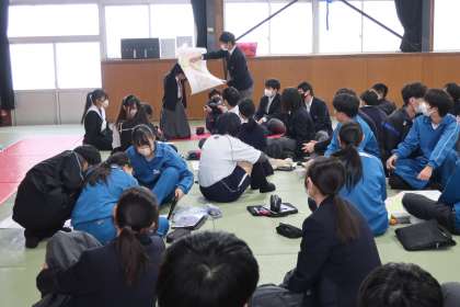 さまざまな学習形態で授業を進める3年生。今回のテーマは防災。講師に愛知工業大学の教授をお招きして行いました。