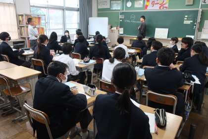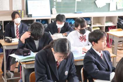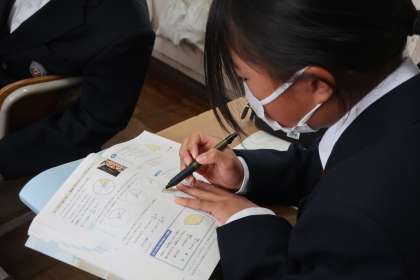 「おうぎ形の面積や弧の長さを求めよう」をテーマに学習が進められていました。それぞれが導き出した答えを自信をもって発表していました。