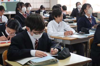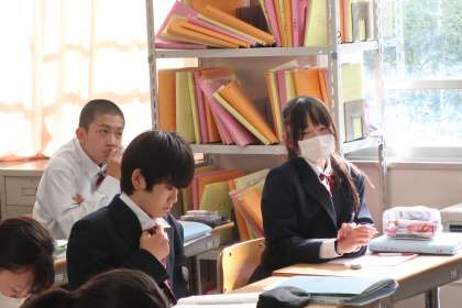 「おうぎ形の面積や弧の長さを求めよう」をテーマに学習が進められていました。それぞれが導き出した答えを自信をもって発表していました。