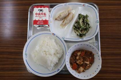 麻婆豆腐、海藻サラダ、ぎょうざ、ごはん、牛乳 でした。
