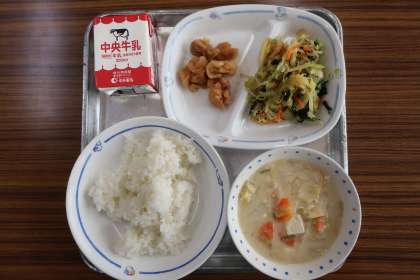 豆乳のバランスみそ汁、アーモンドあえ、とり肉のおろしソースかけ、ごはん、牛乳 でした。