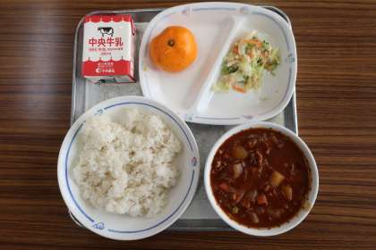 ハヤシライス(麦ごはん)、チキンサラダ、みかん(生)、牛乳 でした。