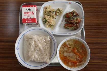 野菜あんかけめん(ソフトめん)、切り干し大根とツナのサラダ、ちくわの磯辺揚げ、牛乳 でした。