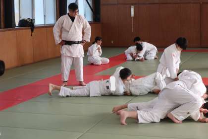 地域指導者の熱心な指導の下、生徒たちも意欲的に活動していました。寝技への持ち込み方の練習に取り組んでいます。