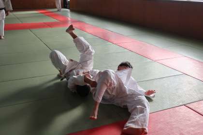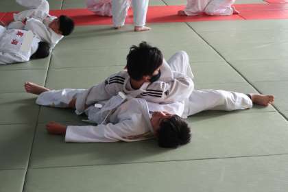地域指導者の熱心な指導の下、生徒たちも意欲的に活動していました。寝技への持ち込み方の練習に取り組んでいます。