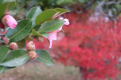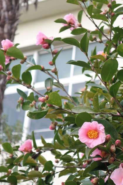 職員室南側の植え込みの植わるツバキの様子です。鮮やかなピンク色の花がたくさん咲いています。寒さは増していますが、見ていて心が温まる風景です。