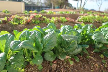 職員室南側の花壇にある「ほっとガーデン」。冬場にも収穫できる野菜を種をまき、現在はサニーレタスや大根も順調に成長しています。なかでも小松菜の成長は著しく、2日おきに生徒が収穫し、先生方へのおすそ分けもされています。