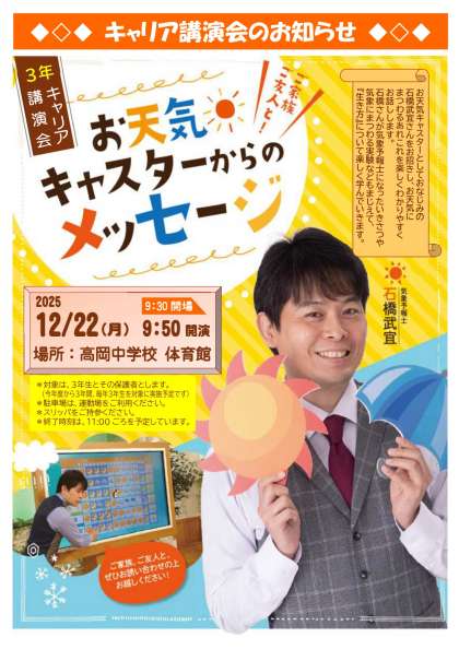 今日は、3年生とその保護者を対象としたキャリア教育講演会を開催します。講師は、テレビでおなじみの気象予報士・石橋武宜さんです。気象予報士になったいきさつや気象に関する実験、テレビの裏側などのお話も交えて、「生き方」について楽しく学ぶ機会を設けます。