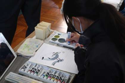 江戸時代に発展した日本美術の流派の一つである「琳派」。この作品を参考に琳派風の作品を制作しています。タブレットで決めた配色に従って、色づくりに苦労しながら作品づくりを進めていました。