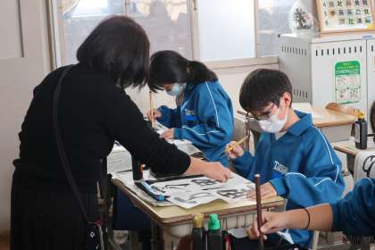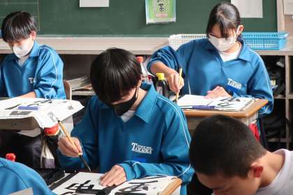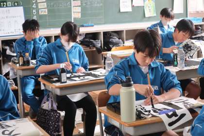 冬休み明けに実施される書き初め大会に向け、練習が始まりました。講師さんをお招きしての活動です。冬休みもしっかり練習に取り組めるよう、この授業で撮影した講師さんの解説動画を配信していく予定です。