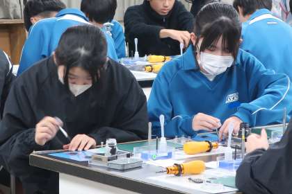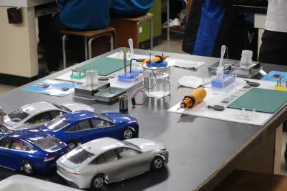 トヨタ自動車の皆さんの丁寧で分かりやすい説明のおかげで、水素・脱炭素化・ものづくりへの興味関心が高まったこの出前講座。未来の自分たちの生活を想像しながら、水素で走る燃料電池ミニカーの製作を体験していました。