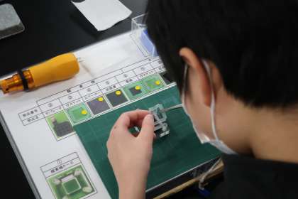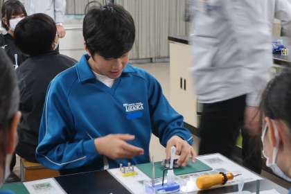 トヨタ自動車の皆さんの丁寧で分かりやすい説明のおかげで、水素・脱炭素化・ものづくりへの興味関心が高まったこの出前講座。未来の自分たちの生活を想像しながら、水素で走る燃料電池ミニカーの製作を体験していました。