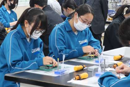 トヨタ自動車の皆さんの丁寧で分かりやすい説明のおかげで、水素・脱炭素化・ものづくりへの興味関心が高まったこの出前講座。未来の自分たちの生活を想像しながら、水素で走る燃料電池ミニカーの製作を体験していました。