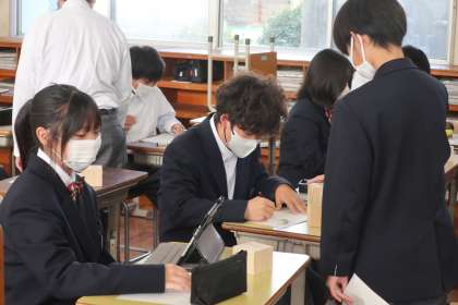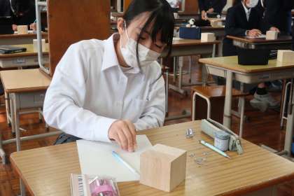 立方体の模型を使って、スケッチの基礎を学んでいます。見る角度によって面の形が変わることを意識したり、全体のバランスを考えたりしながらスケッチしていました。