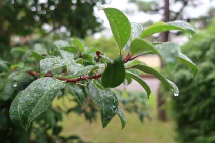 朝方も少し雨が降り、草木の葉には雨露がついていました。