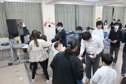 高岡中の校区にある2校の小学校(若林東小・若林西小)から小学生たちをお迎えしました。各学校の出し物やゲーム、中学生から小学生へクリスマスプレゼントを手渡すなど、楽しいひとときを過ごしました。