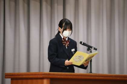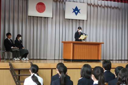 表彰伝達のあとは、各学年の代表者によるスピーチの発表が行われました。(写真は、1年生の代表生徒の発表の様子です)