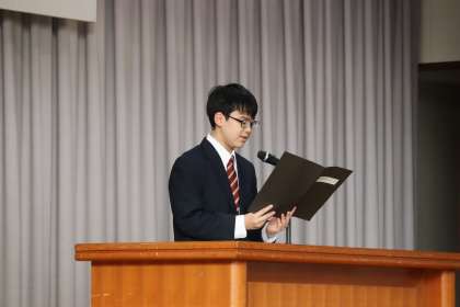 表彰伝達のあとは、各学年の代表者によるスピーチの発表が行われました。(写真は、2年生の代表生徒の発表の様子です)