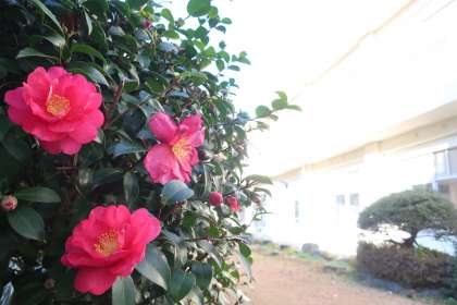 校内のあちこちで咲くツバキの花。まだまだたくさんのつぼみもあり、これからもしばらくはこの光景が楽しめると思うと期待でいっぱいになります。