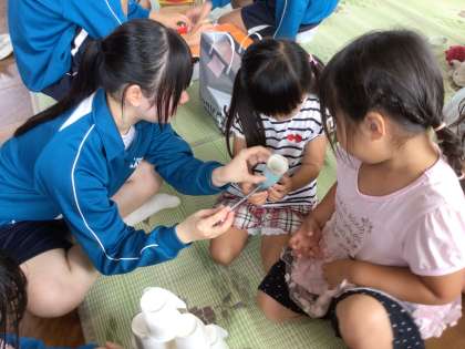 家庭科の授業で園児たちが安全に楽しめるおもちゃをつくり、どんな活動が喜ばれるかをしっかり調べるなど、万全の準備をして実習に臨みました。