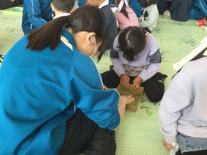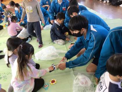 家庭科の授業で園児たちが安全に楽しめるおもちゃをつくり、どんな活動が喜ばれるかをしっかり調べるなど、万全の準備をして実習に臨みました。
