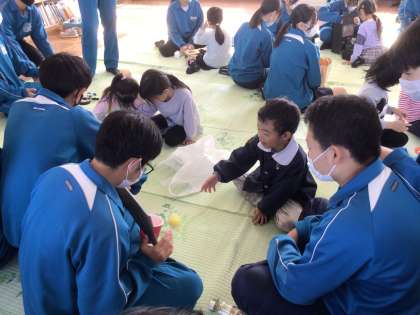 家庭科の授業で園児たちが安全に楽しめるおもちゃをつくり、どんな活動が喜ばれるかをしっかり調べるなど、万全の準備をして実習に臨みました。