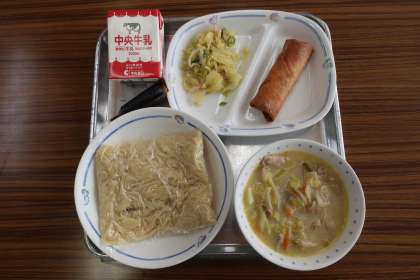 とんこつラーメン(中華めん)、中華サラダ、春巻き、コーヒー牛乳の素、牛乳 でした。