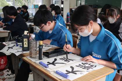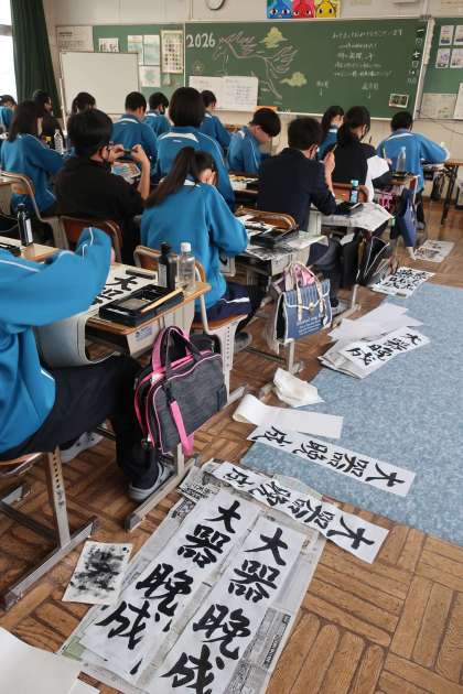 本日の2・3時間目に行われた書き初め大会・2年1組の様子です。
