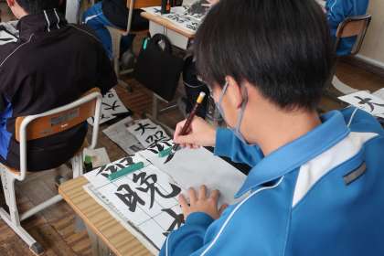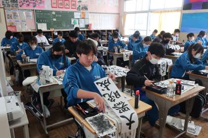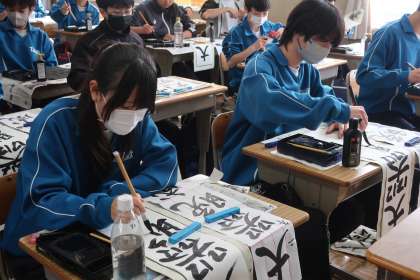 本日の2・3時間目に行われた書き初め大会・2年2組の様子です。