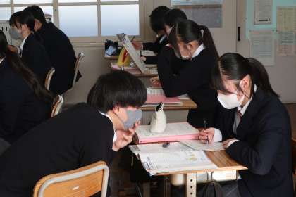 教科書の「Power Your Future」というエネルギー問題に関する説明文を読んで、自分の考えをまとめていました。