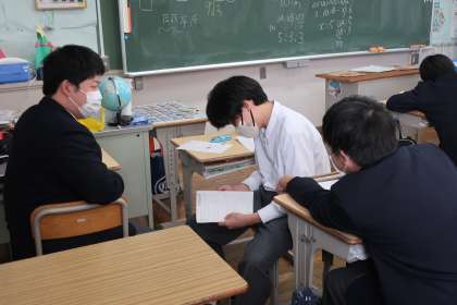 円錐と三平方の定理に関わる難問に挑戦していました。仲間と相談しながら必死に問題に向かっている姿が印象的でした。