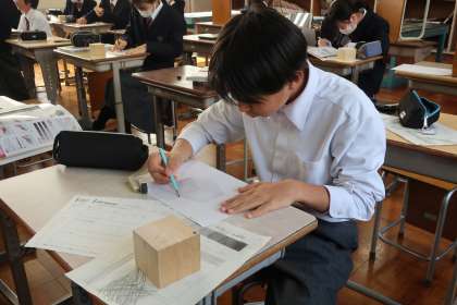 直方体のデッサンの学習で、「形(比率)を意識しながら、光に合わせた正確な明暗をつけよう」をテーマに活動に取り組んでいました。