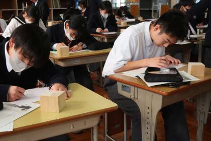 直方体のデッサンの学習で、「形(比率)を意識しながら、光に合わせた正確な明暗をつけよう」をテーマに活動に取り組んでいました。