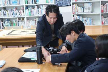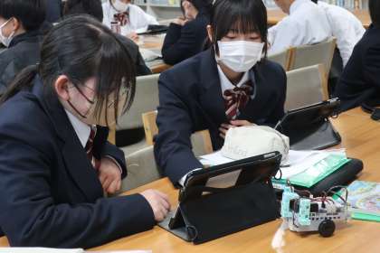 プログラミング学習で、「情報の制御・計測」について、実際にデータを並べ、プログラムどおりに動作が行われるか確認していました。