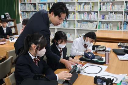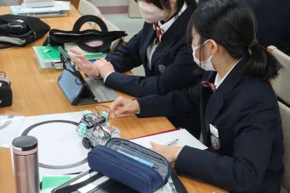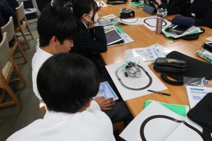 プログラミング学習で、「情報の制御・計測」について、実際にデータを並べ、プログラムどおりに動作が行われるか確認していました。