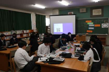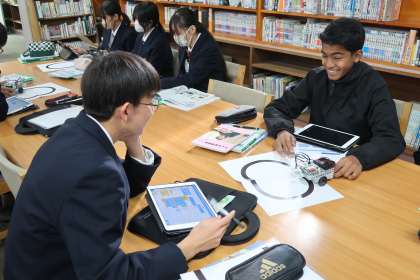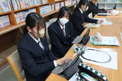プログラミング学習で、「情報の制御・計測」について、実際にデータを並べ、プログラムどおりに動作が行われるか確認していました。