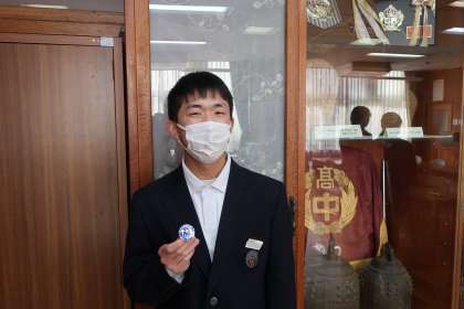仲間の登下校や地域の方々が気持ちよく通行できるようにと活動してくれた生徒たち。缶バッヂを手にした今日も笑顔いっぱいの高中生です。