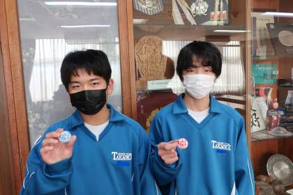 今回は、昨日行われた「学校周辺清掃活動(みどりの郷共催)」に参加した生徒に、学校オリジナル缶バッヂ(=「WE LOVE たかおか」バッジ)が配布されました。