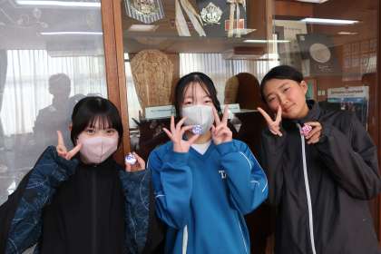 仲間の登下校や地域の方々が気持ちよく通行できるようにと活動してくれた生徒たち。缶バッヂを手にした今日も笑顔いっぱいの高中生です。