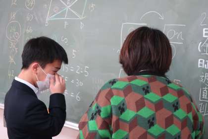 入試対策として、いろいろなパターンの問題に取り組んでいました。助っ人で、他教科の先生も応援に駆け付け、生徒と一緒に問題を解いていました。